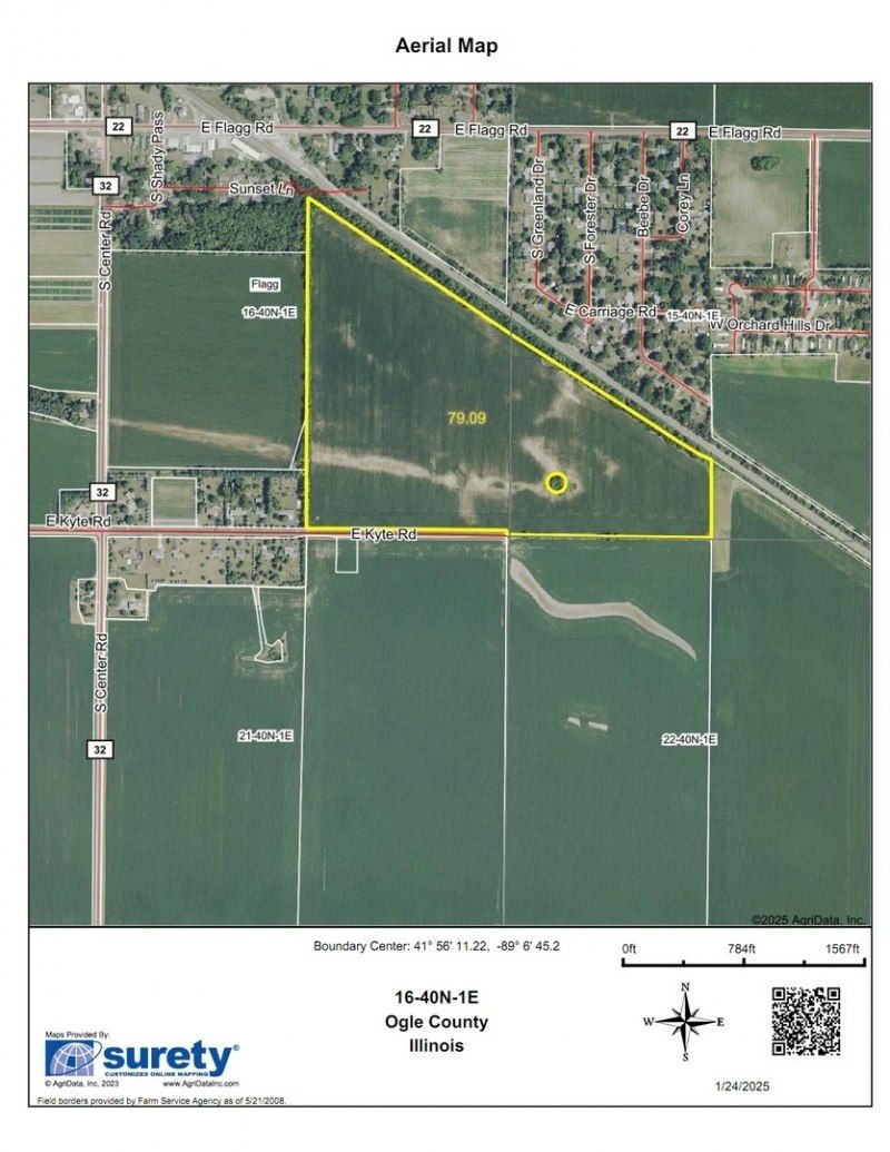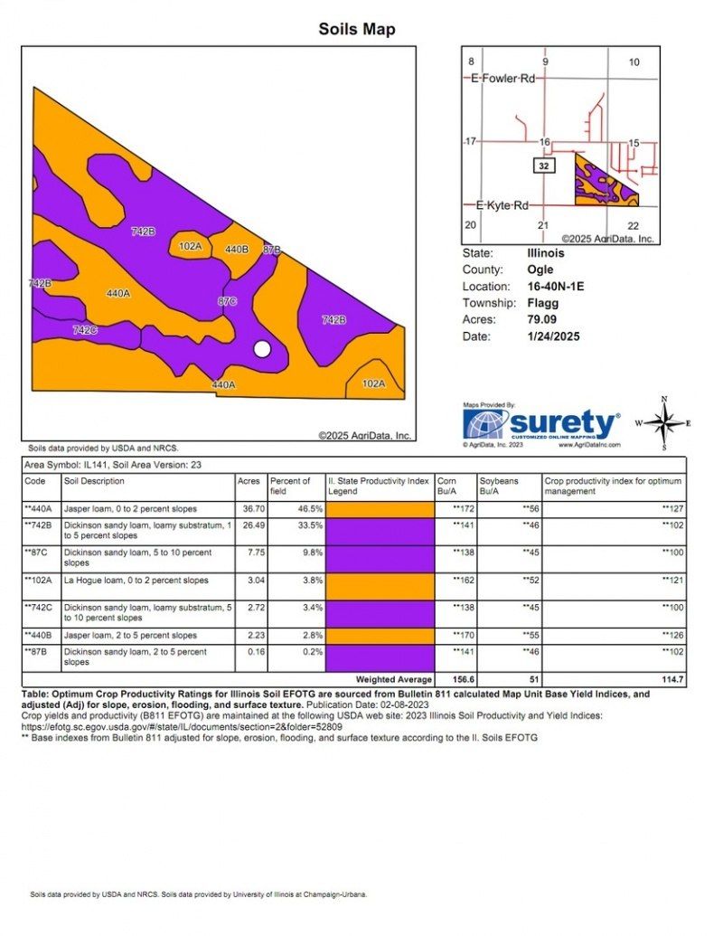 Priced at $14,900.00/Acre, This 80+ Acre track is a great location for residential or commercial development. Property is in the Lee Ogle Enterprise Zone. Frontage on the hard surface Kyte Rd., Soils have a PI of 114.7 with 79.09 Tillable Acres. Potential for BNSF spur access. Lots of opportunities for this tract.